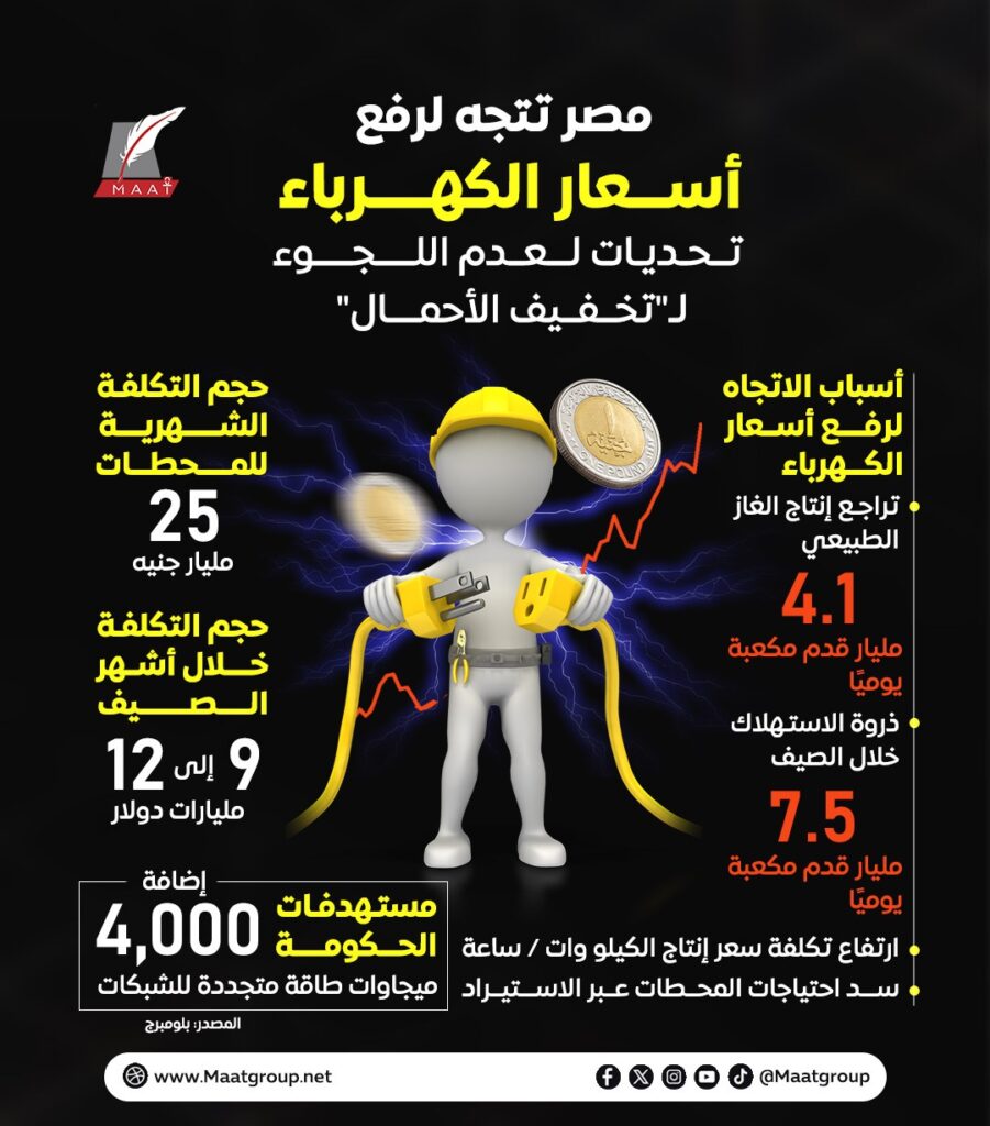 يأتي ذلك لعدة أسباب أهمها زيادة الأعباء المالية على وزارة الكهرباء وارتفاع تكلفة سعر إنتاج الكيلو وات ساعة نظرًا لاعتماد الحكومة سد احتياجات محطات توليد الكهرباء من الغاز والمازوت عبر الاستيراد من الخارج مما يضاعف فاتورة التكلفة الشهرية التي تتعدى 25 مليار جنيه شهريا، وفق إنفوجراف لمؤسسة “ماعت جرب”.