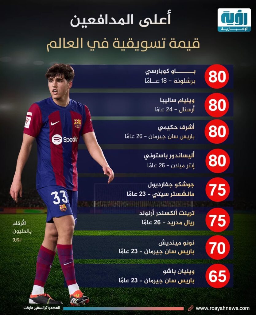 تصدر الرباعي باو كوبارسي، ويليام ساليبا، أشرف حكيمي، وأليساندرو باستوني، قائمة المدافعين الأعلي قيمة تسويقية في العالم حاليًا، إذ تبلغ قيمة كل منهم 80 مليون يورو، رغم تفاوت الأعمار بينهم، إذ يبلغ باو كوبارسي مدافع برشلونة 18 عامًا فقط.