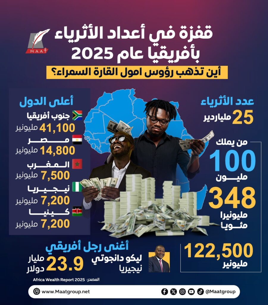 وبلغ عدد الأثرياء ، في جنوب أفريقيا وحدها 41,100 مليونير، أي ما يعادل 34% من إجمالي مليونيرات القارة، وفق إنفوجراف لمؤسسة “ماعت جروب”.